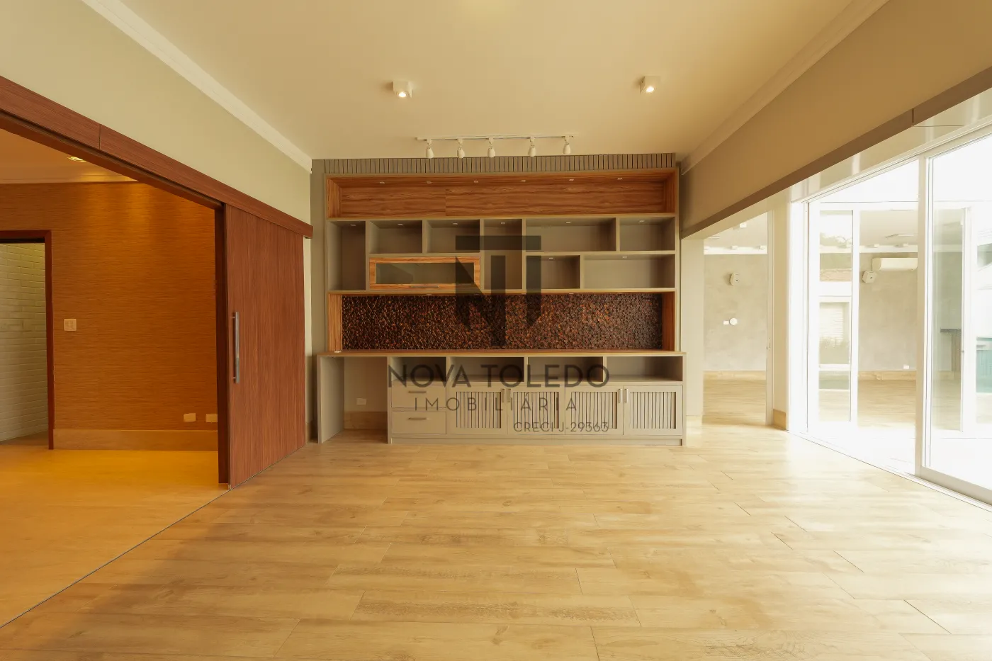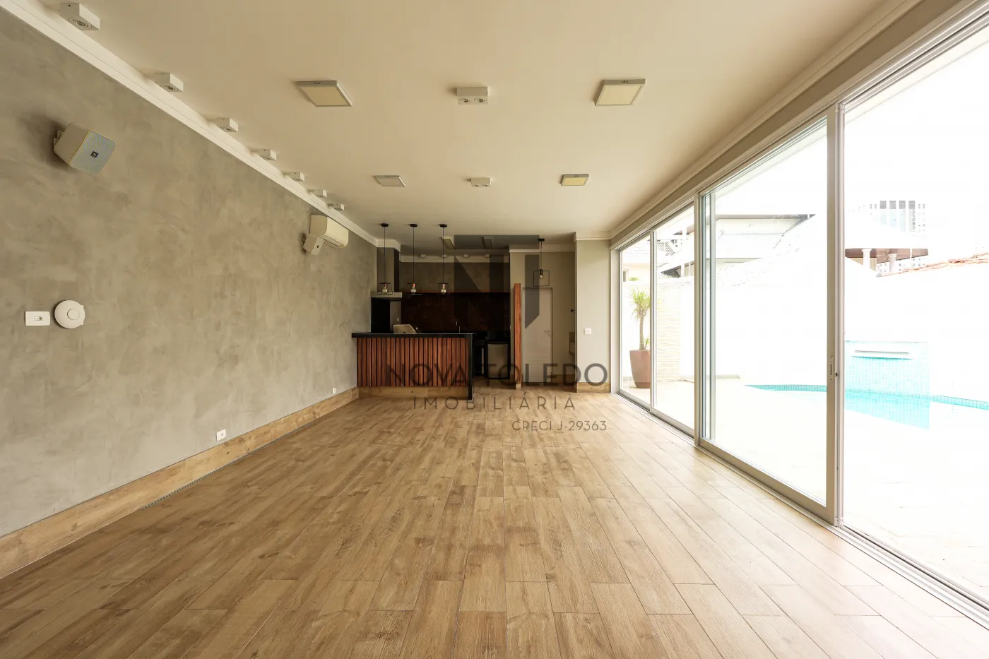 - Sala de lareira com esquadria em vidro com vista para piscina, movelaria (painel de TV + estante) ar condicionado, cortinas automáticas e sonorização