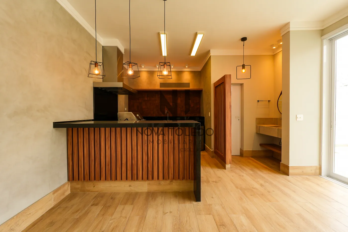 - Sala de estar + jantar com sonorização, iluminação indireta e painel de madeira ripado