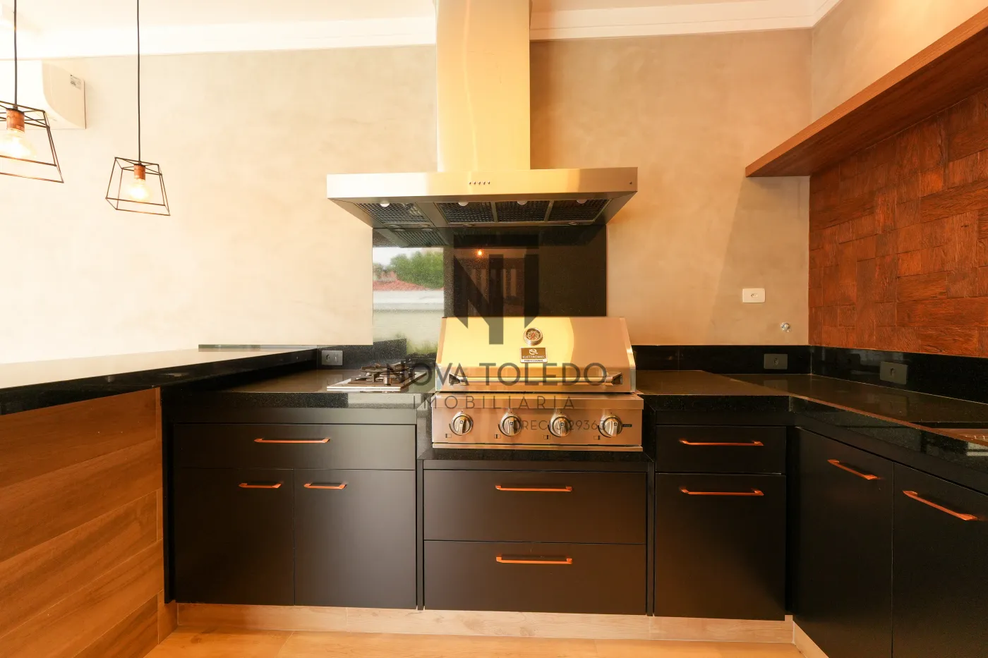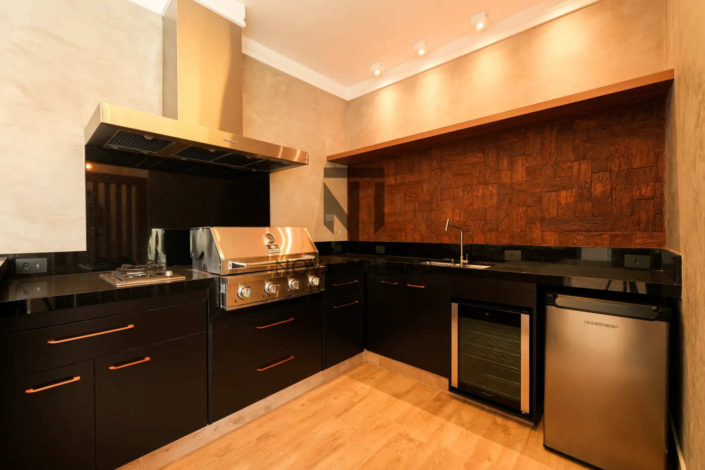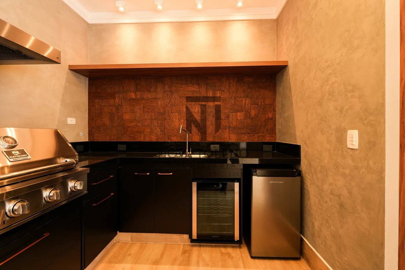 - Área gourmet (coifa, cooktop, churrasqueira a gás ELETROMEC, adega e frigobar), ar condicionado, sonorização e fechamento com esquadria de vidro.