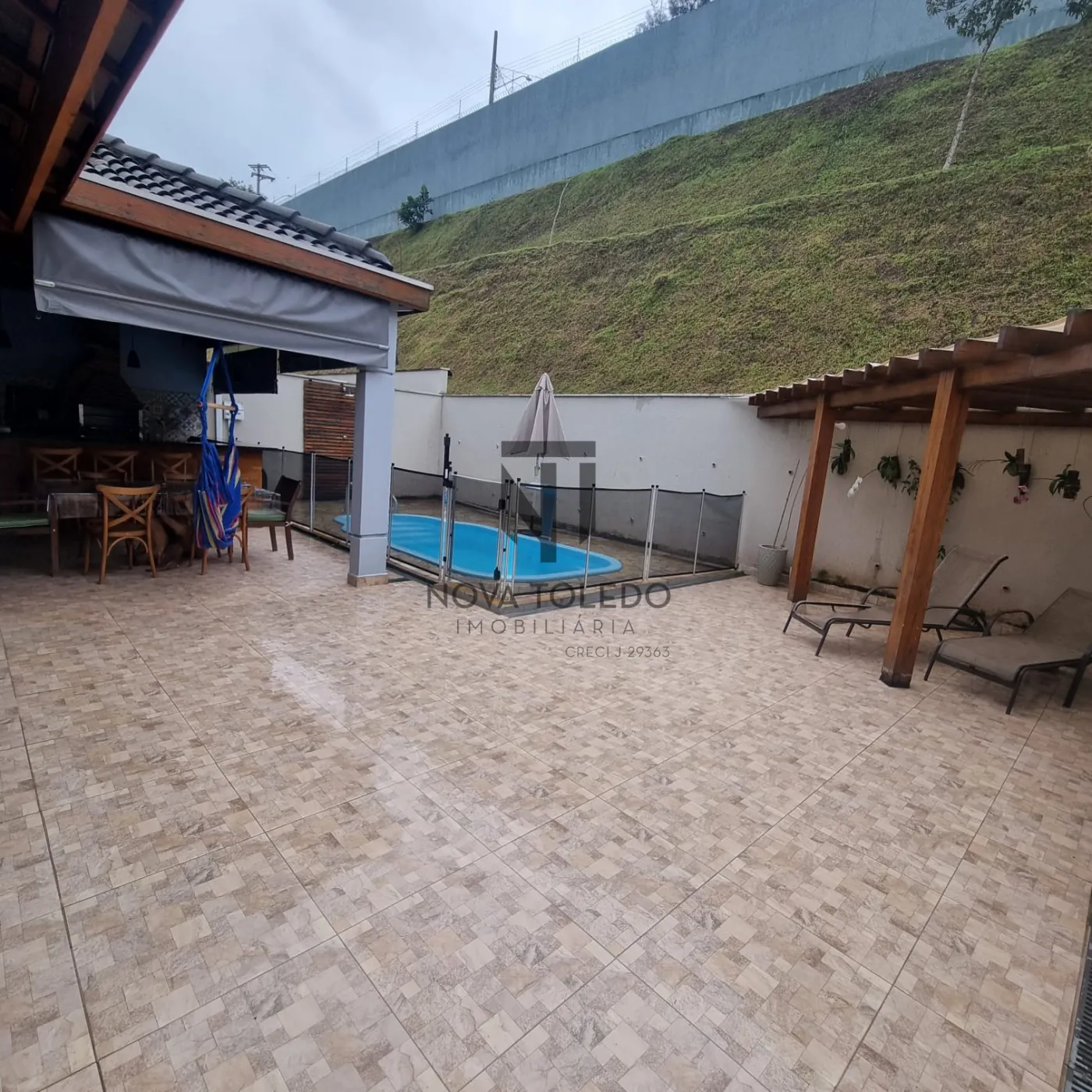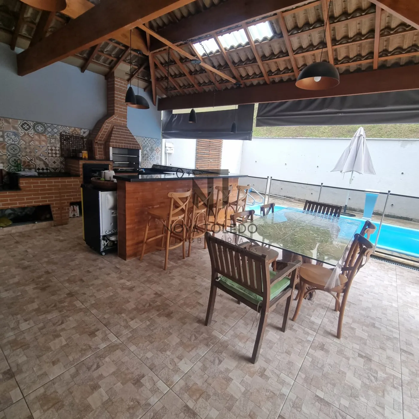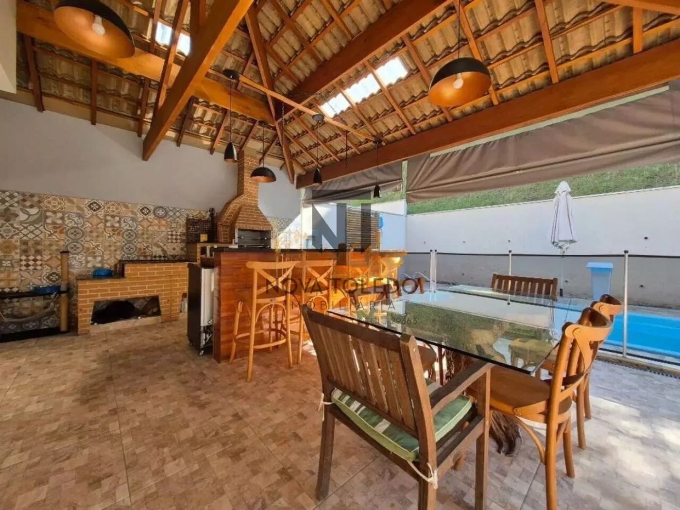 - Área gourmet completa com churrasqueira, forno a lenha, fogão, bancada generosa e piscina.