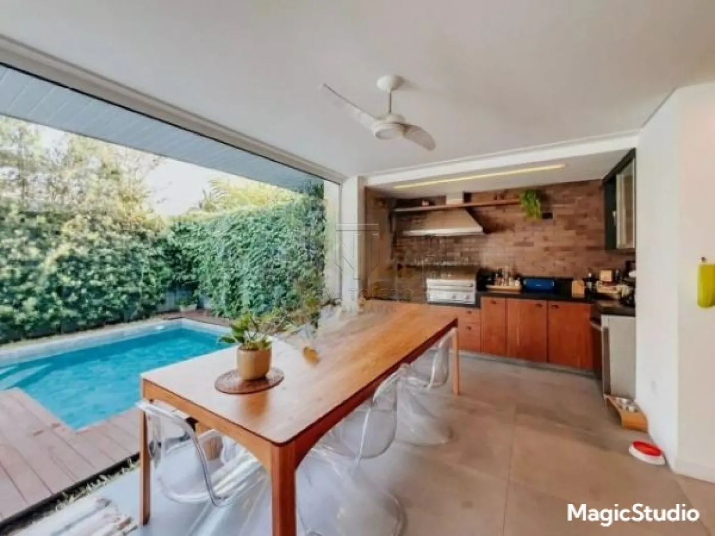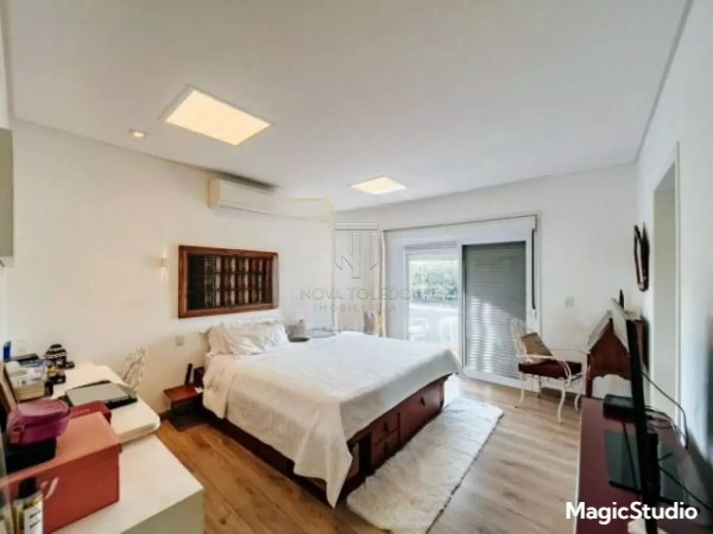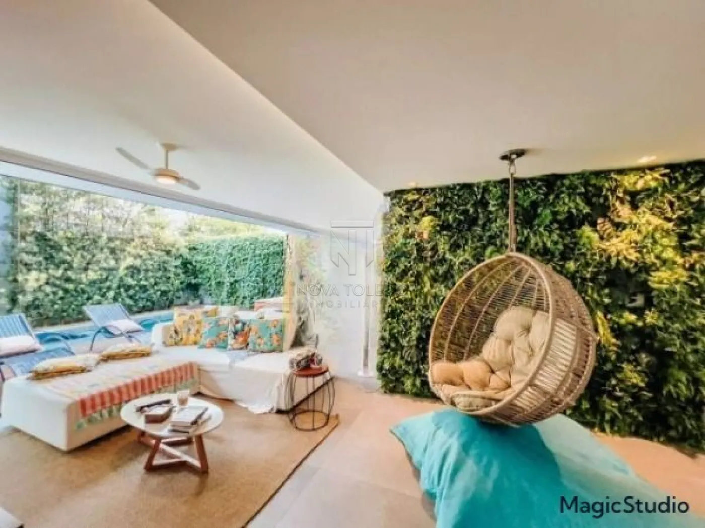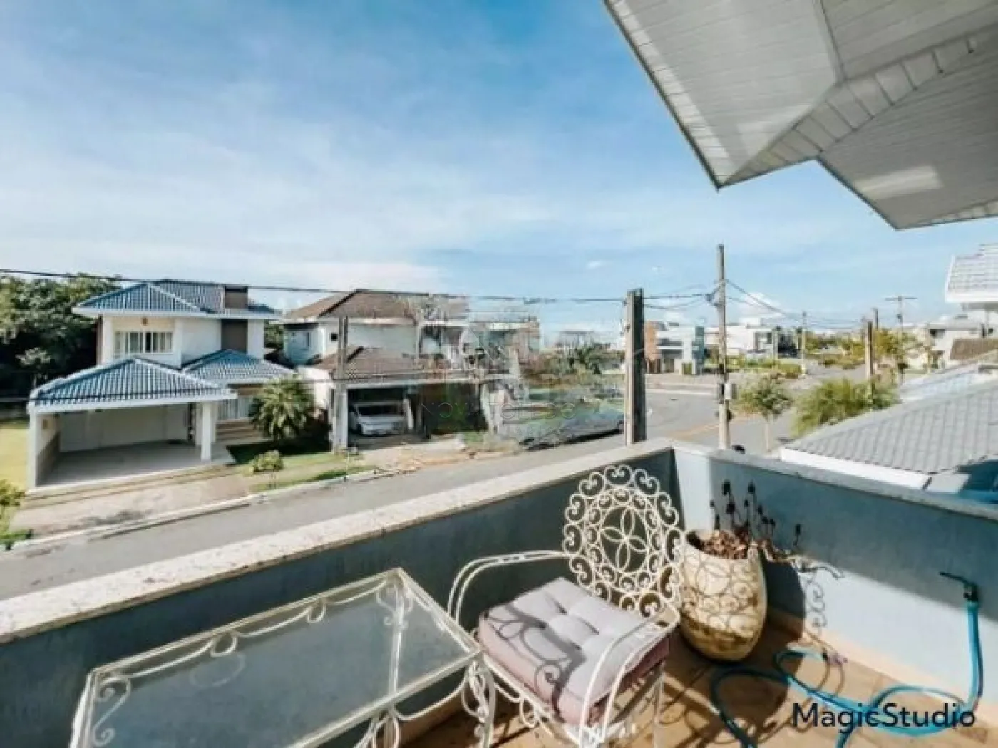 Casa com 3 suítes, sendo uma suíte master com closet, banheira de hidromassagem e varanda, todas com ar condicionado e sala íntima. Sala ampla para 2 ambientes, sala íntima, cozinha planejada e equipada com cooktop, forno e microondas. Área gourmet com fechamento em vidro, integrada com a sala e a cozinha. Piscina aquecida com prainha, deck em madeira e jardim. Garagem coberta para 2 carros.