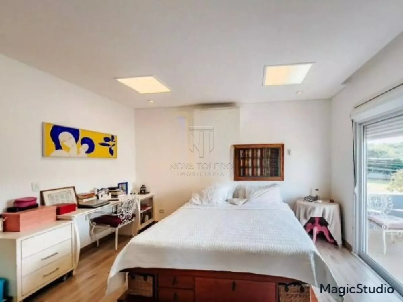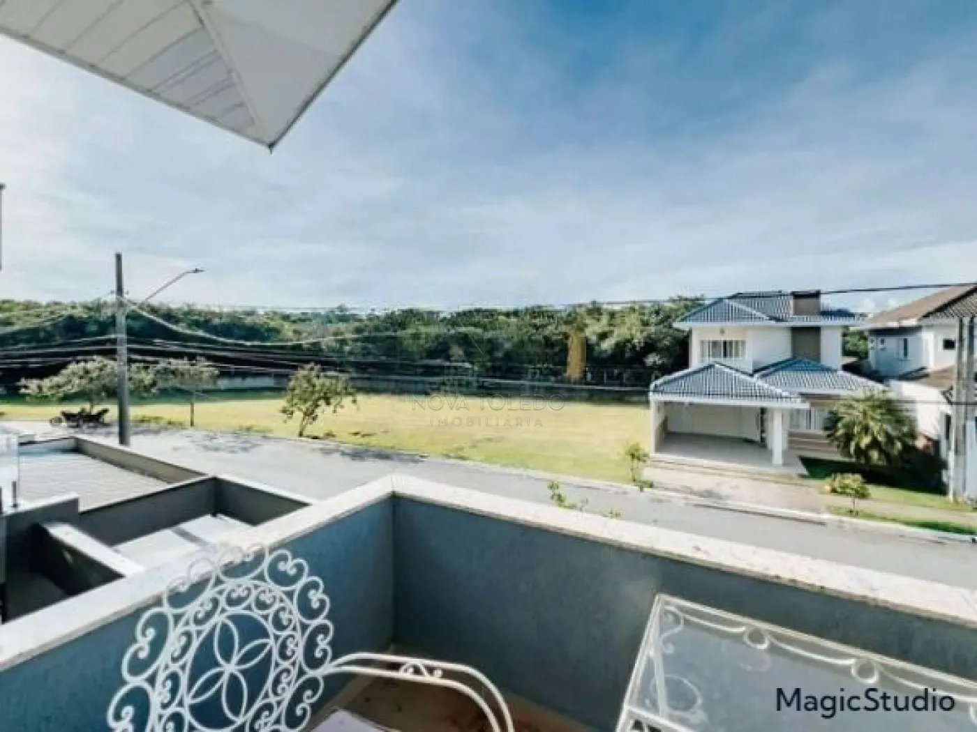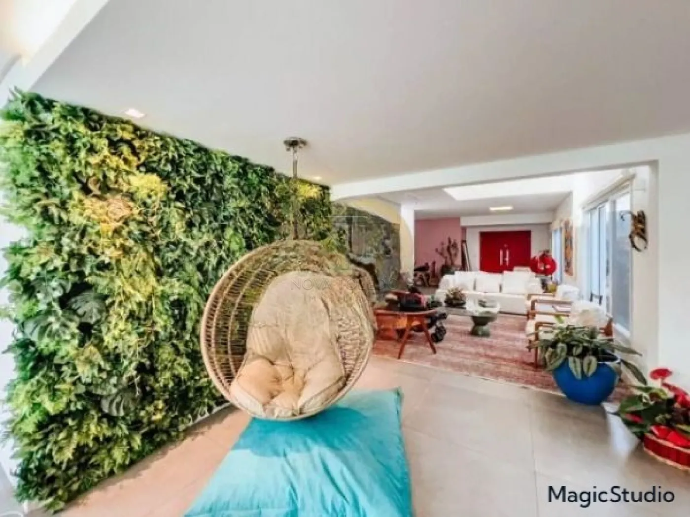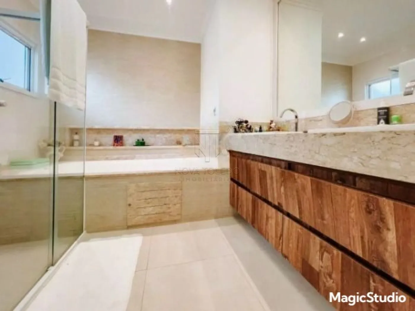 Casa com 3 suítes, sendo uma suíte master com closet, banheira de hidromassagem e varanda, todas com ar condicionado e sala íntima. Sala ampla para 2 ambientes, sala íntima, cozinha planejada e equipada com cooktop, forno e microondas. Área gourmet com fechamento em vidro, integrada com a sala e a cozinha. Piscina aquecida com prainha, deck em madeira e jardim. Garagem coberta para 2 carros.