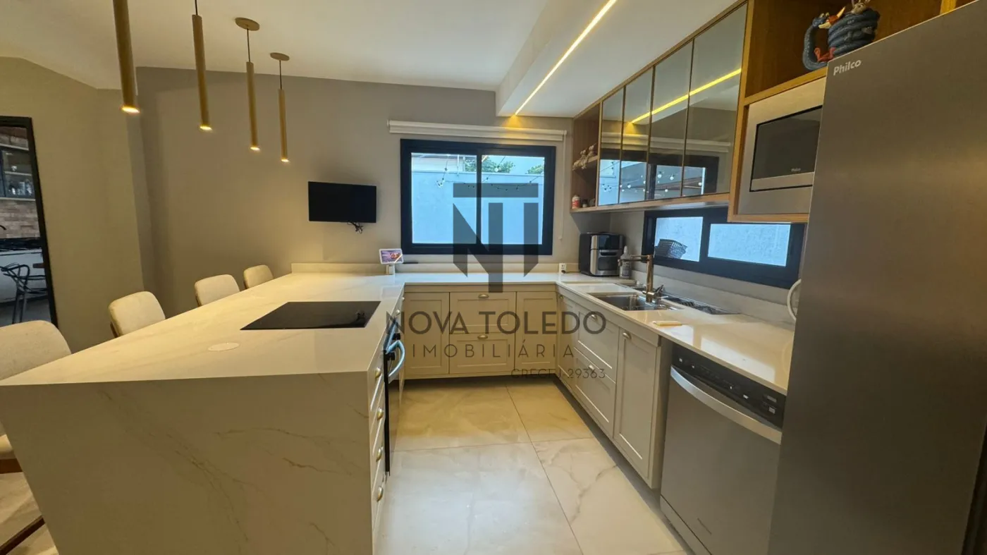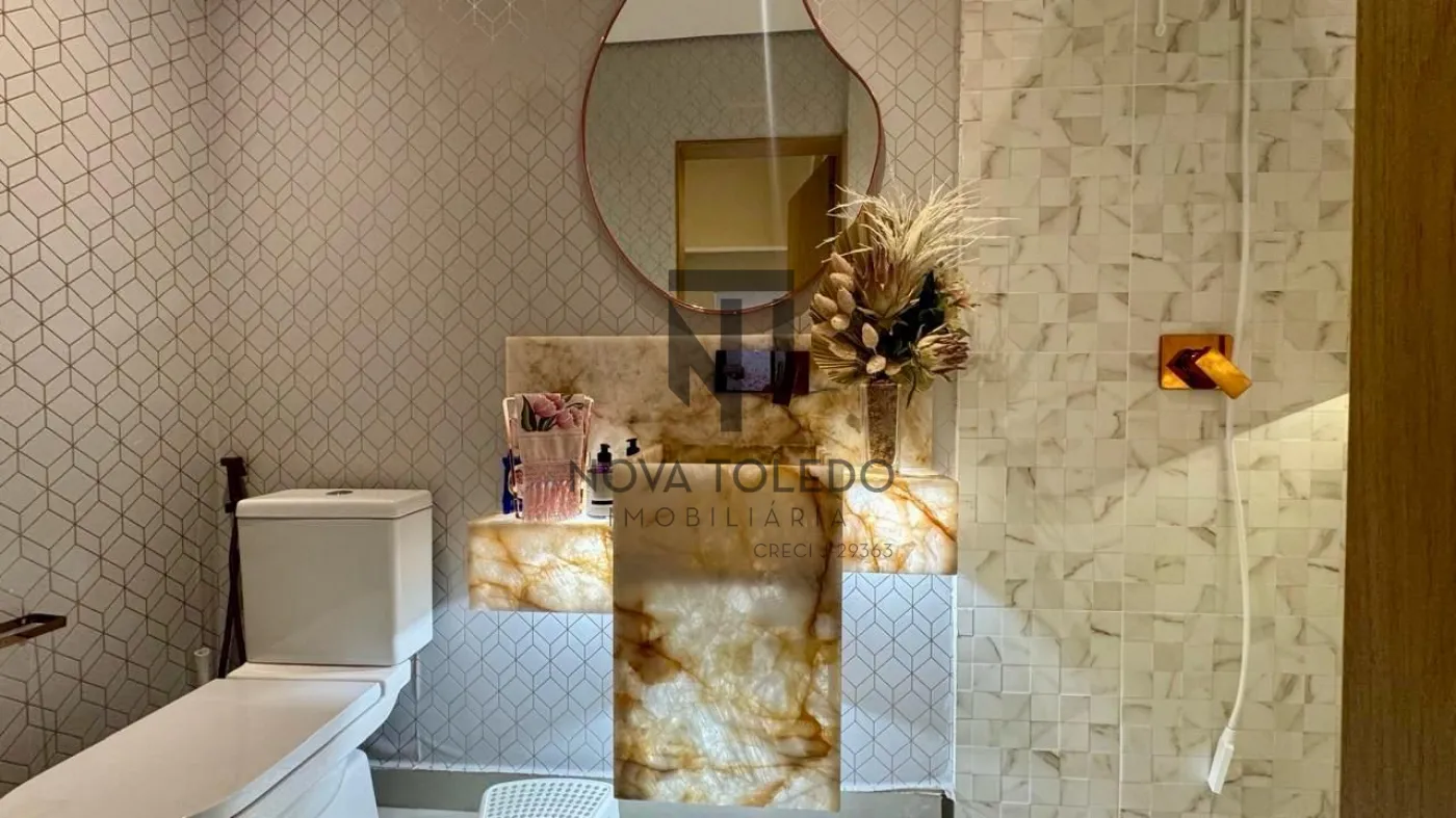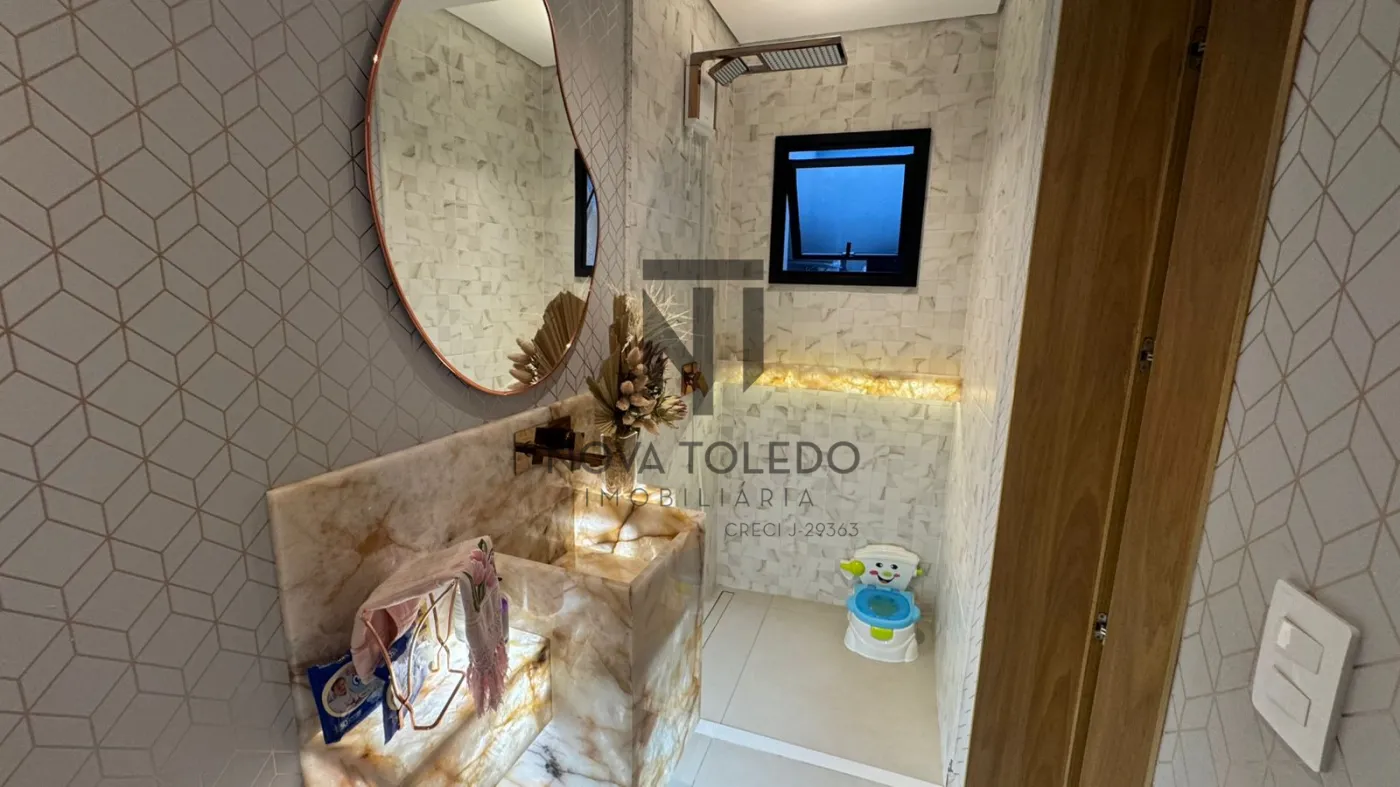- Cozinha com granito Calacatta Gold e banheiro interno com granito translúcido iluminado, trazendo sofisticação e exclusividade.