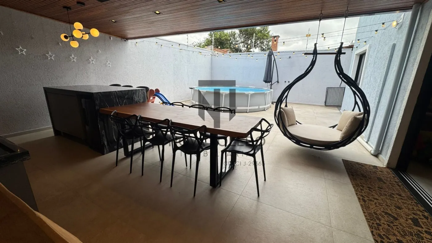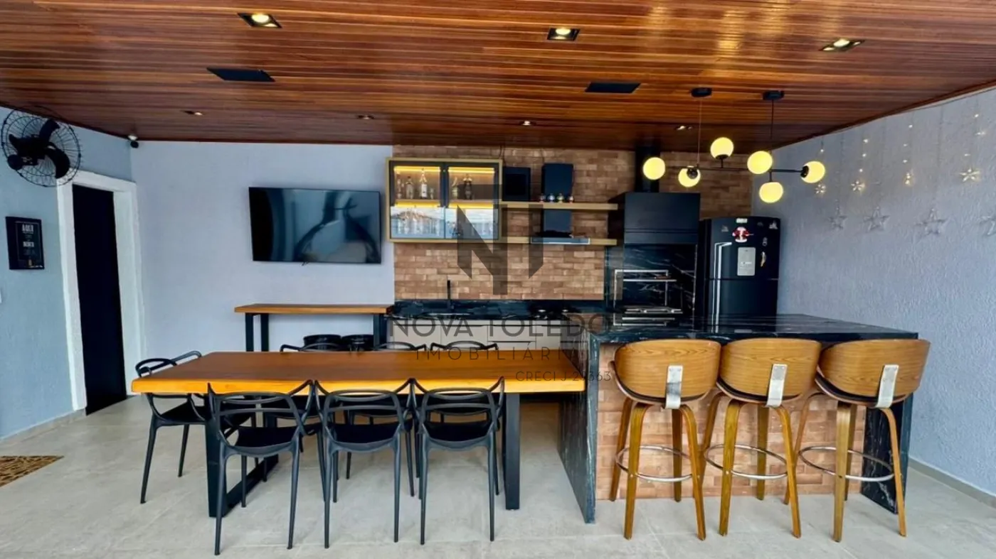 - Área gourmet completa, com churrasqueira, cooktop, geladeira, mesa em madeira e banheiro externo;