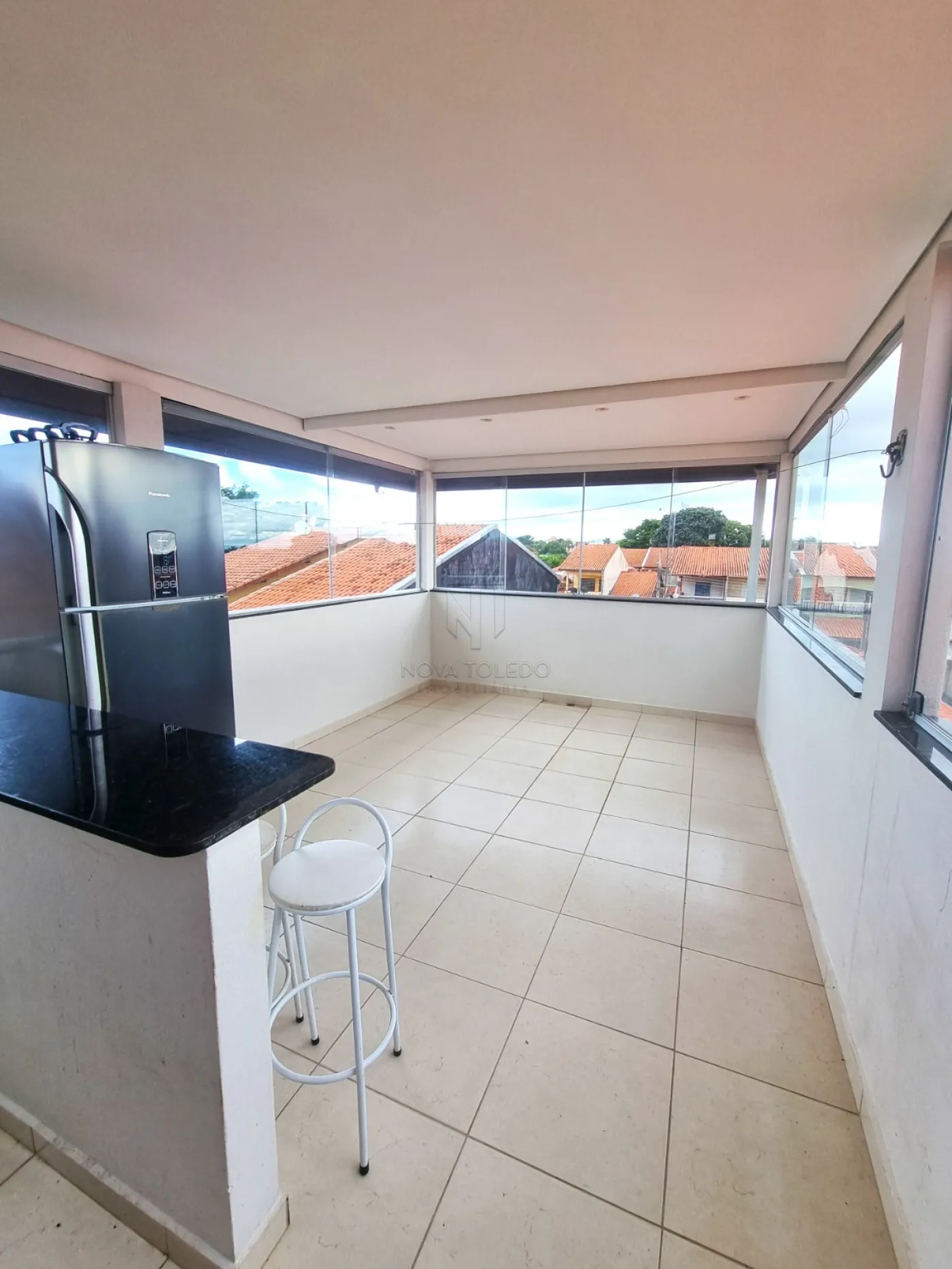 - Churrasqueira com armários planejados e varanda.