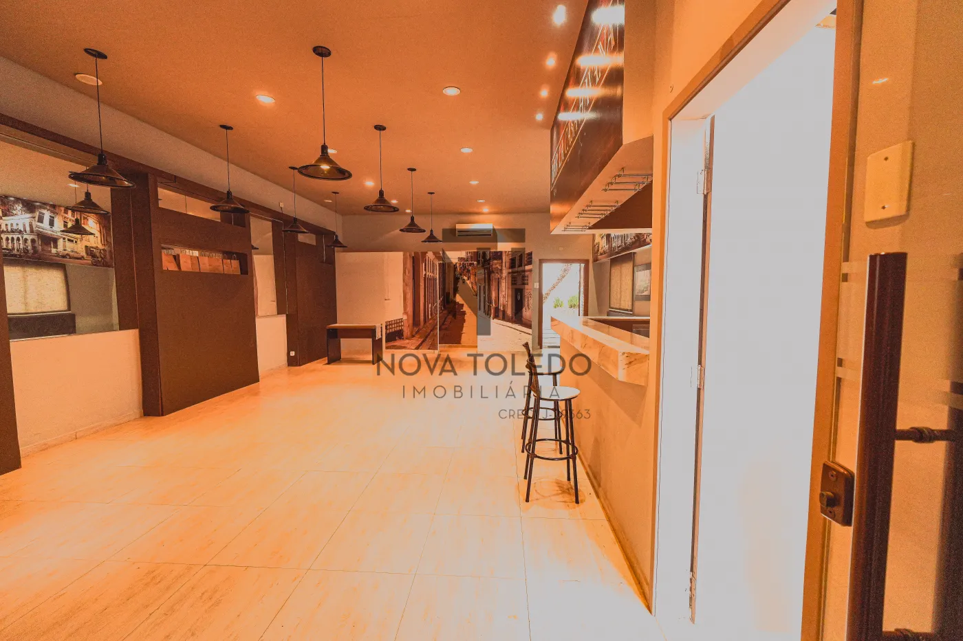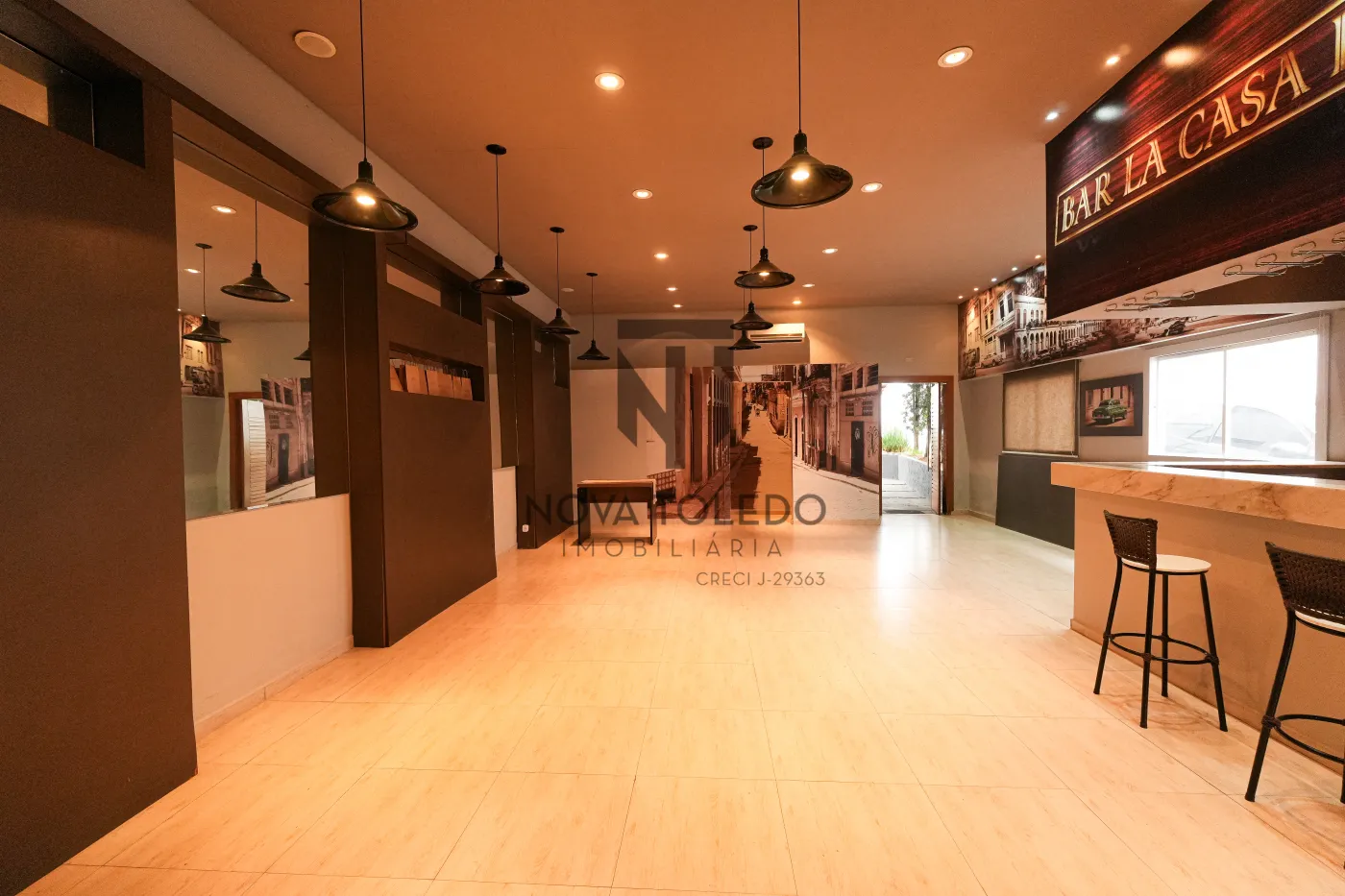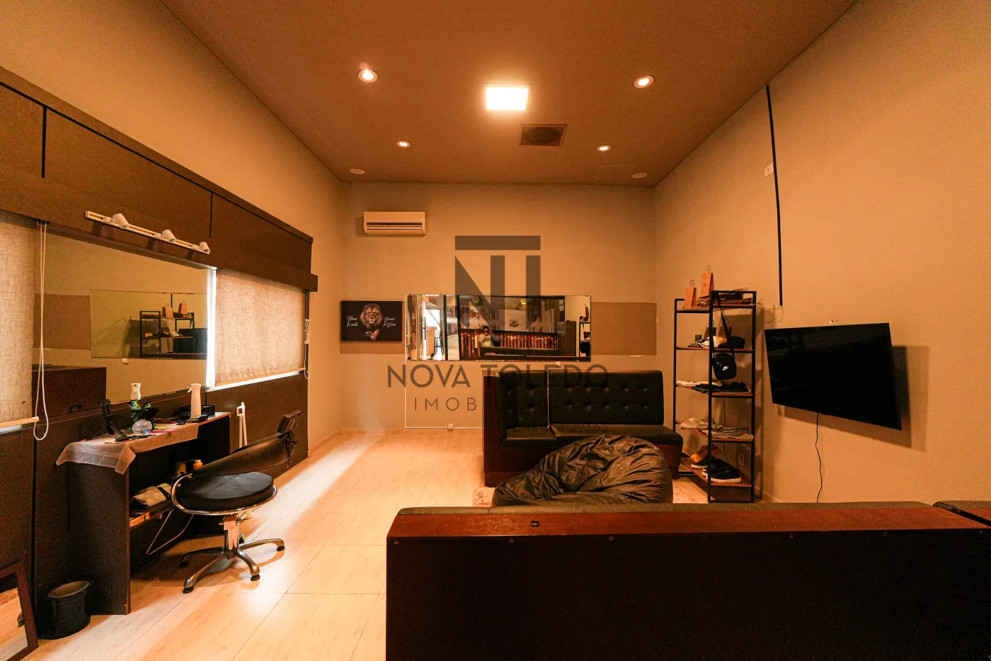 Salão grande (100 m²) com pé-direito adequado e compartimentos bem planejados.