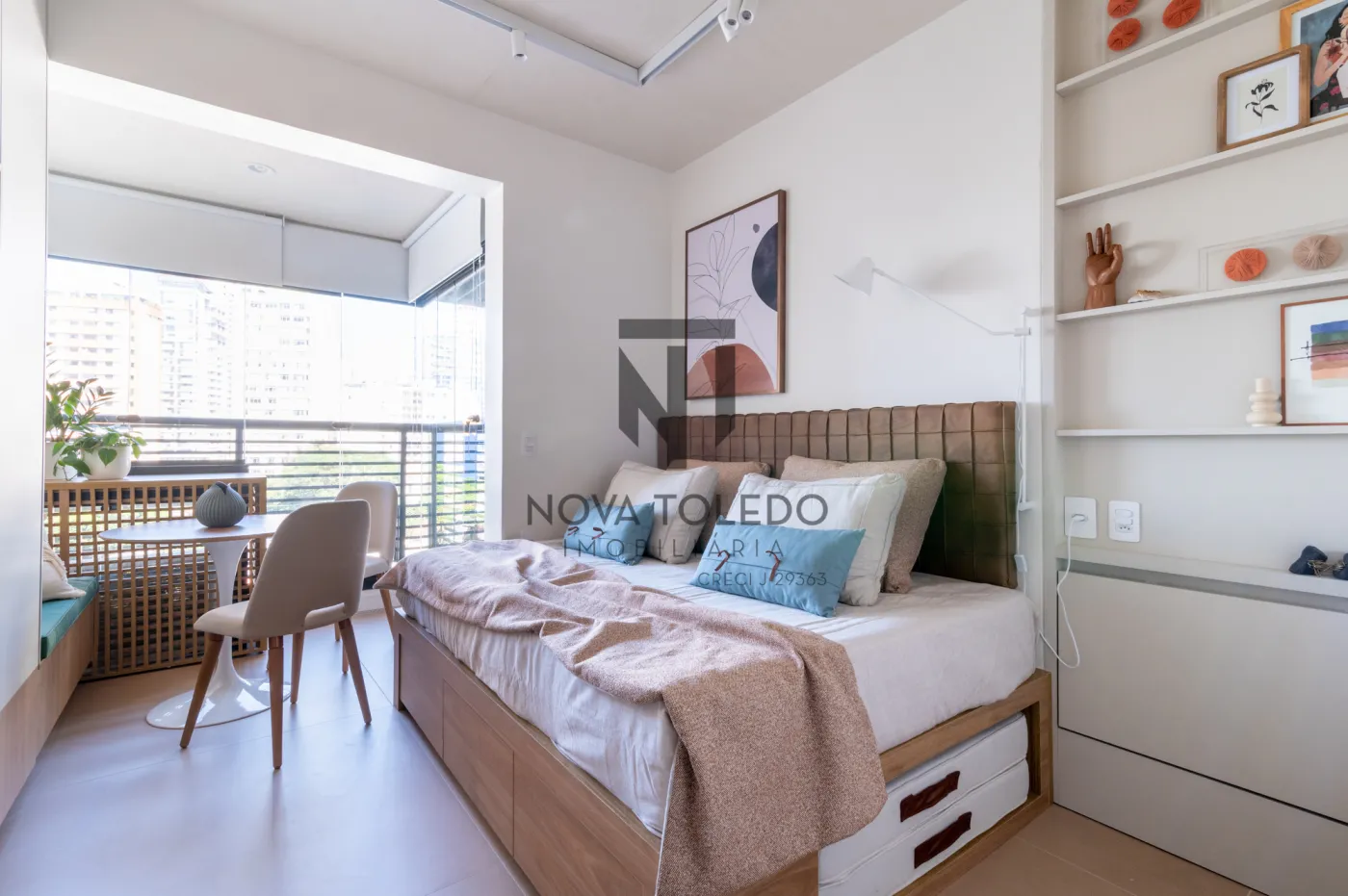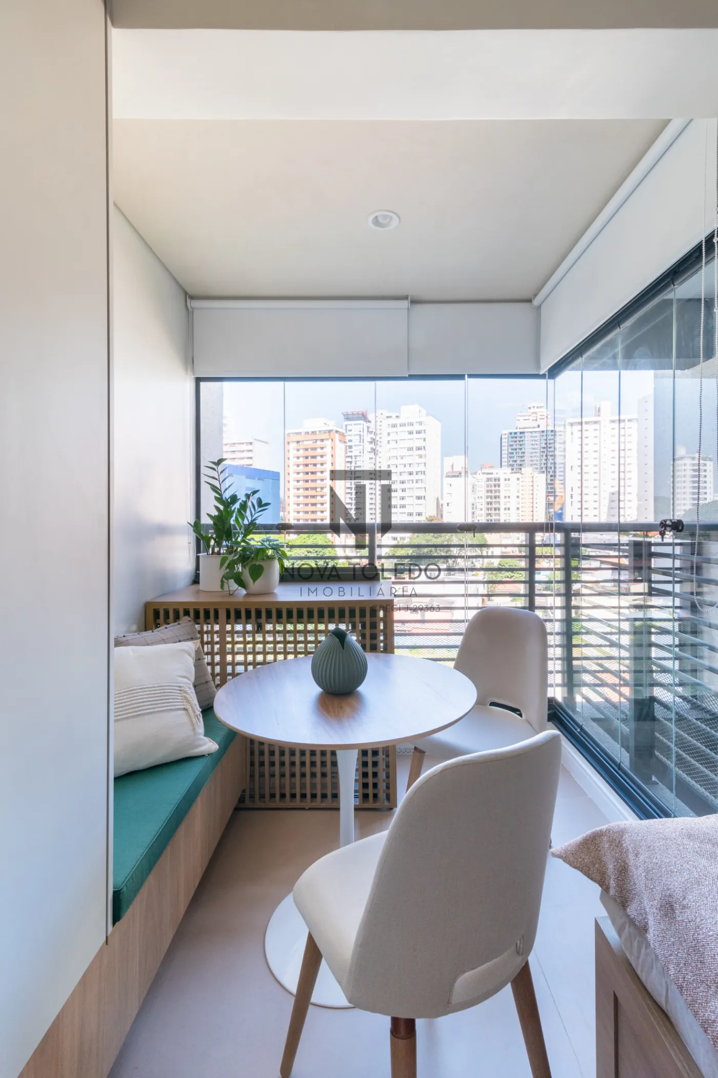 - Área de estar com mesa para duas pessoas e sofá planejado